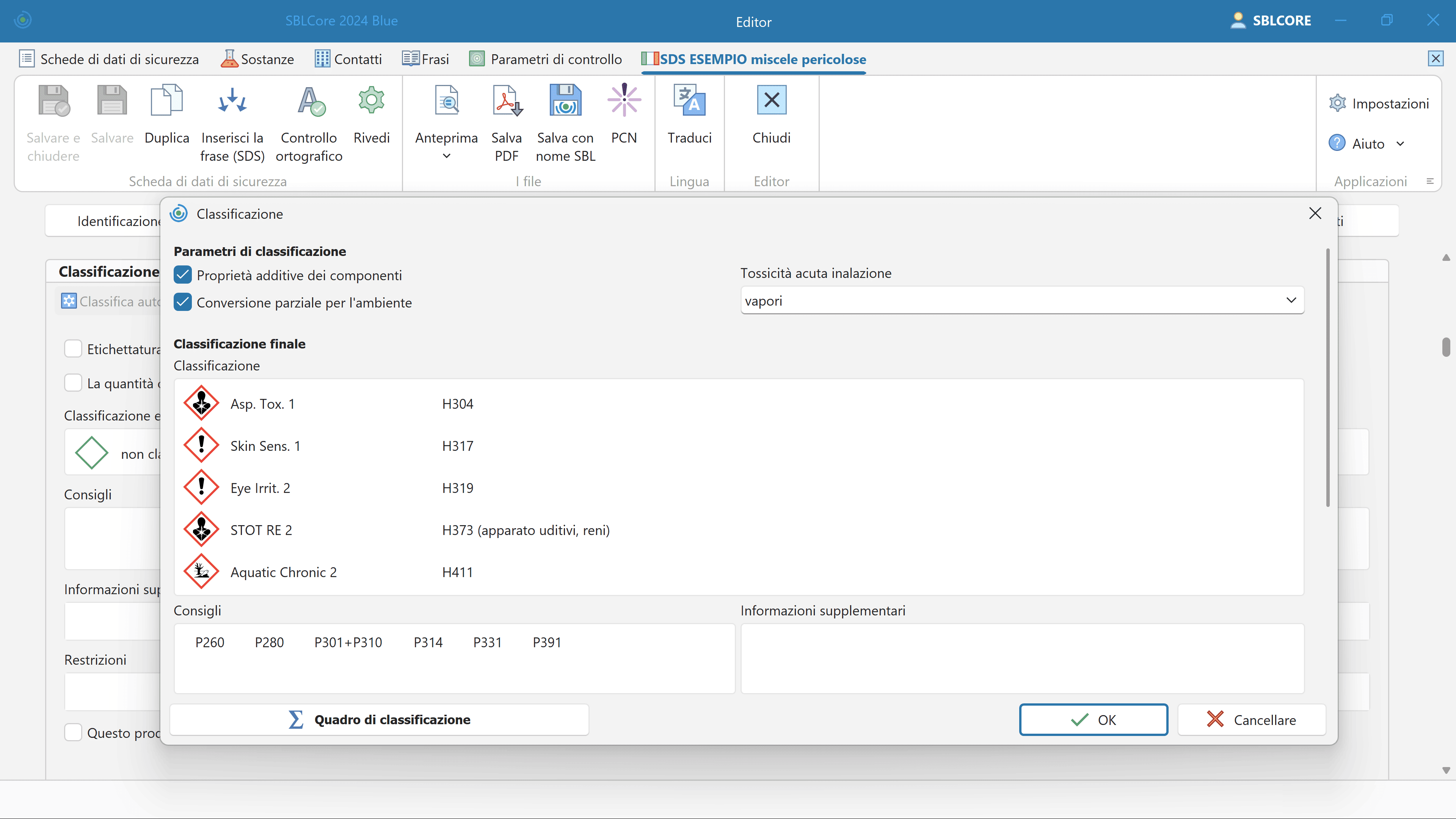 Il programma valuta il livello di pericolo del prodotto. Il calcolo considera non solo le proprietà delle singole sostanze, ma anche le loro interazioni, utilizzando formule che sommano i loro effetti. Viene inoltre calcolata la tossicità acuta (ATE) e ricalcolati gli indicatori utilizzati per valutare la pericolosità ambientale.
