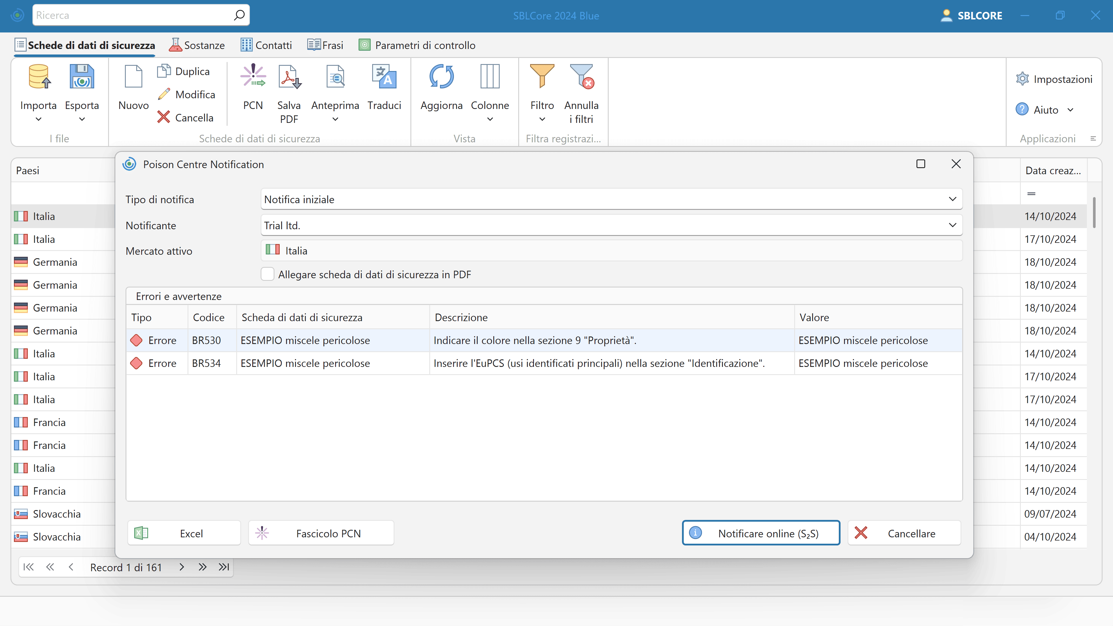 Collega SBLCore direttamente ai centri antiveleni tramite l’interfaccia system2system (S2S) e semplifica la notifica PCN. La cronologia necessaria per i futuri aggiornamenti viene salvata automaticamente. Se desideri notificare manualmente, puoi esportare il file e inviarlo tu stesso.