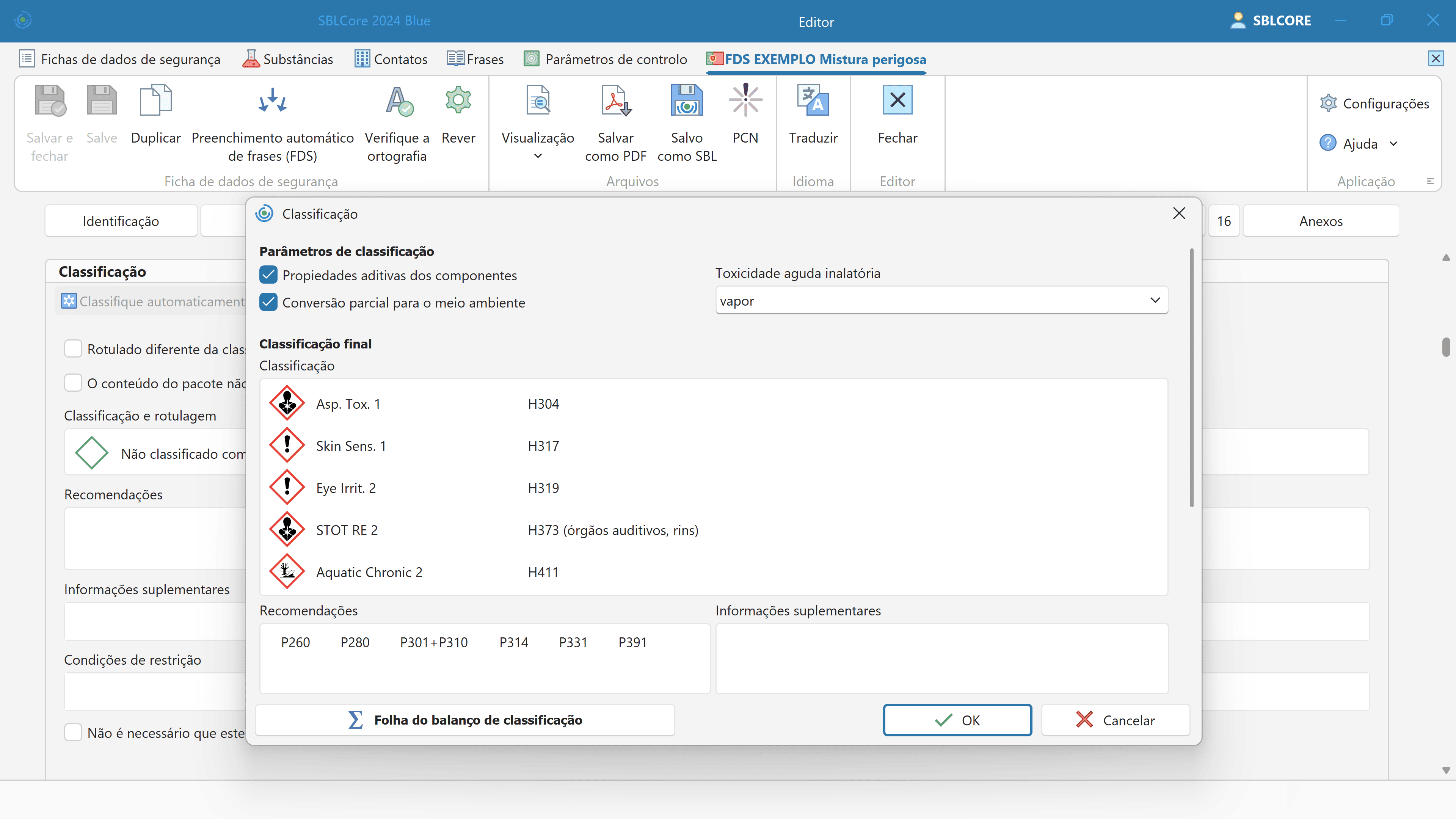 Com base na percentagem de ingredientes individuais na mistura e suas informações toxicológicas e ecotoxicológicas, o programa calcula automaticamente a classificação correta. A classificação automática inclui um relatório de classificação.