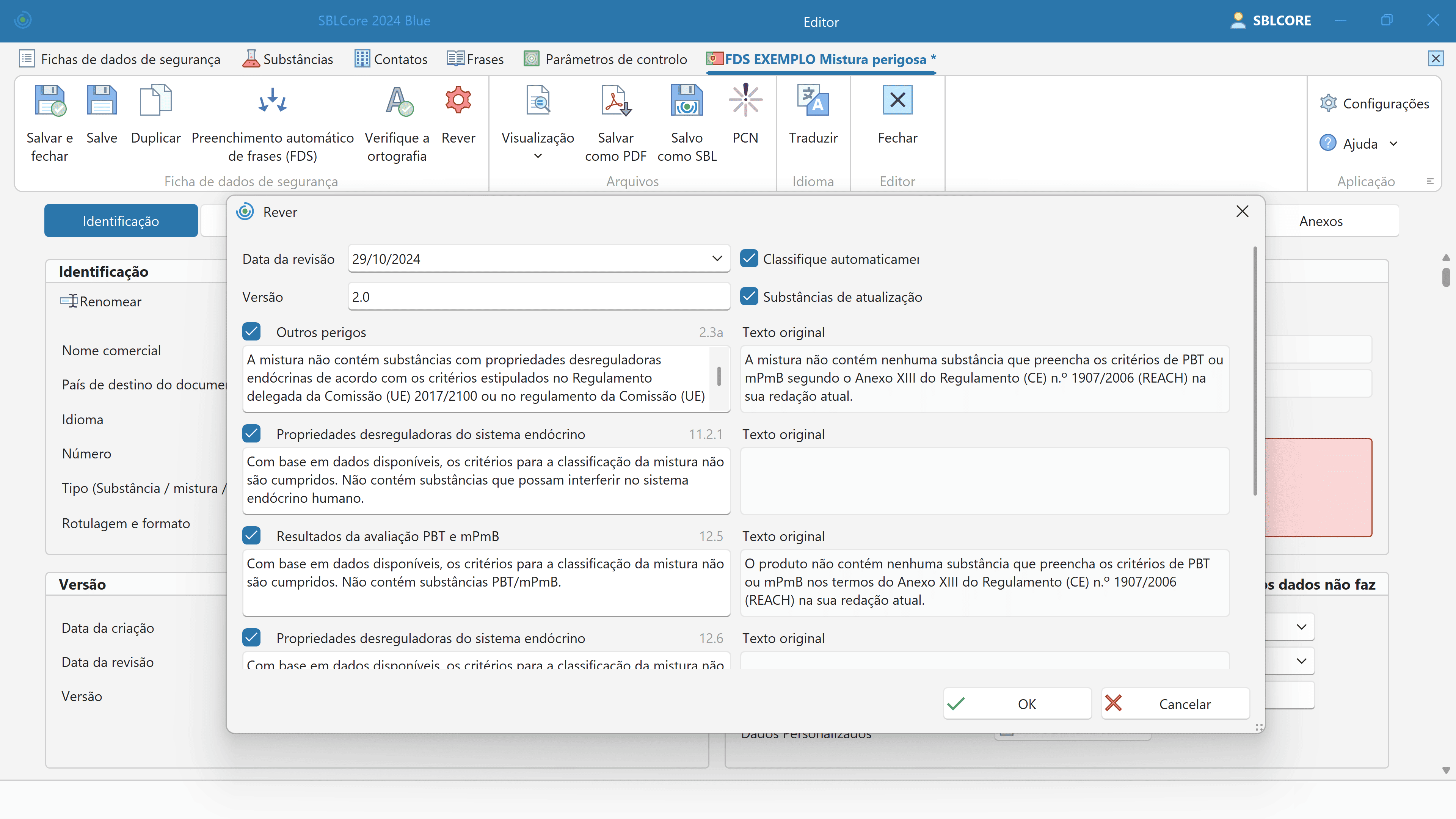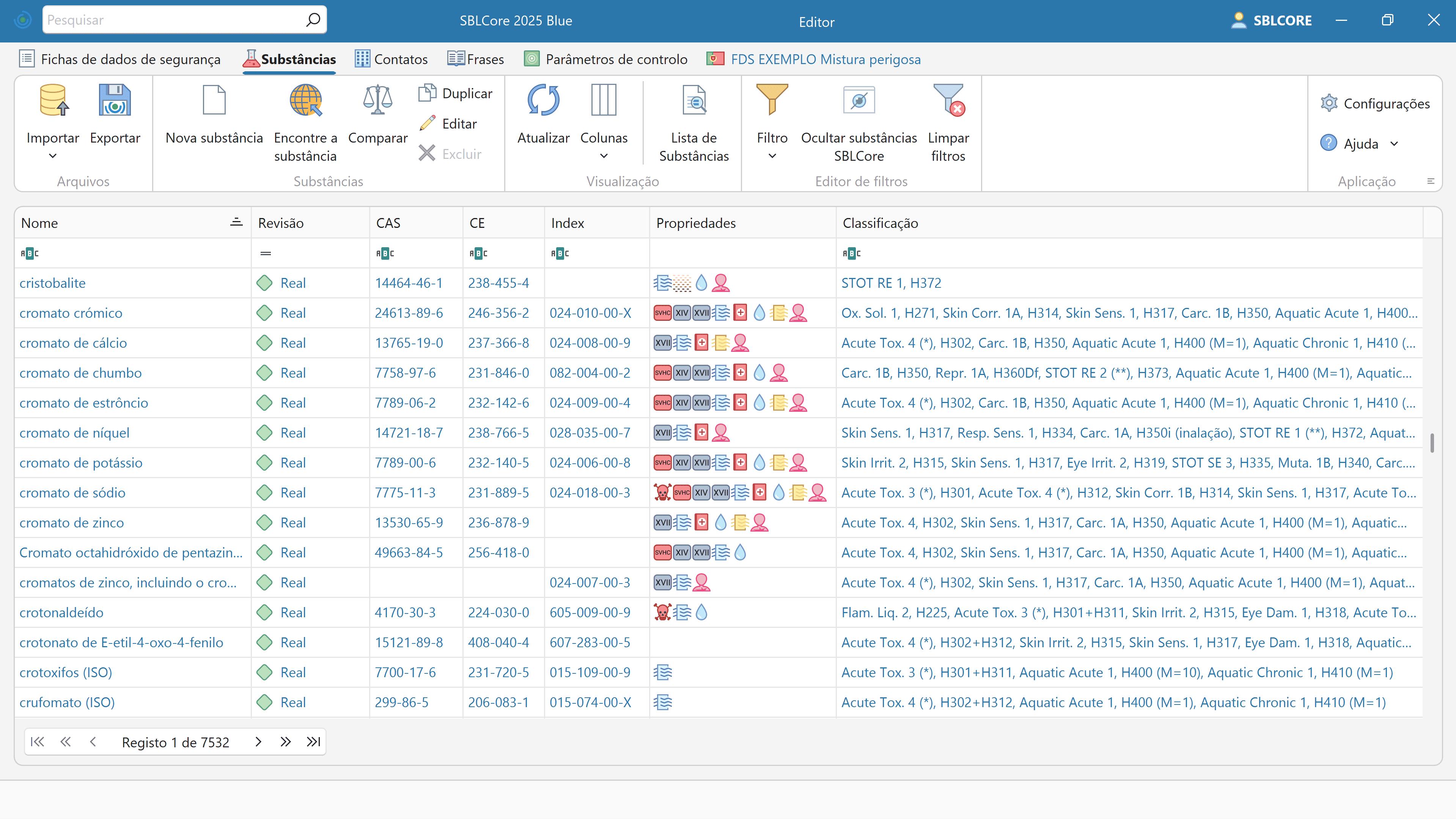 O software contém uma base de dados de substâncias com classificação harmonizada de acordo com o anexo VI do Regulamento CLP e substâncias que devem seguir as orientações sobre limites de exposição para o ambiente de trabalho.