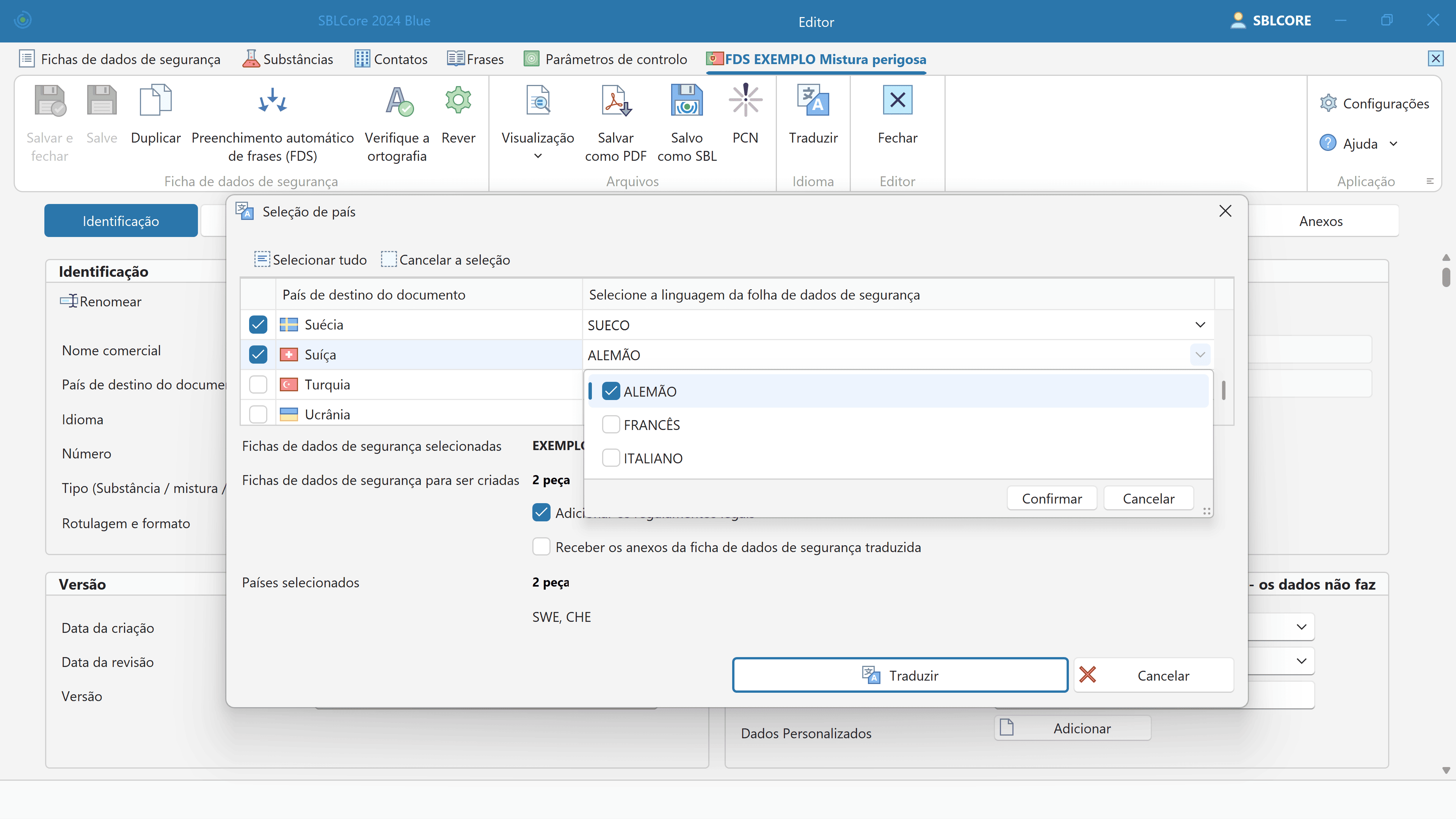 Com um único clique, a ficha de dados de segurança pode ser facilmente convertida em qualquer um dos idiomas do software.