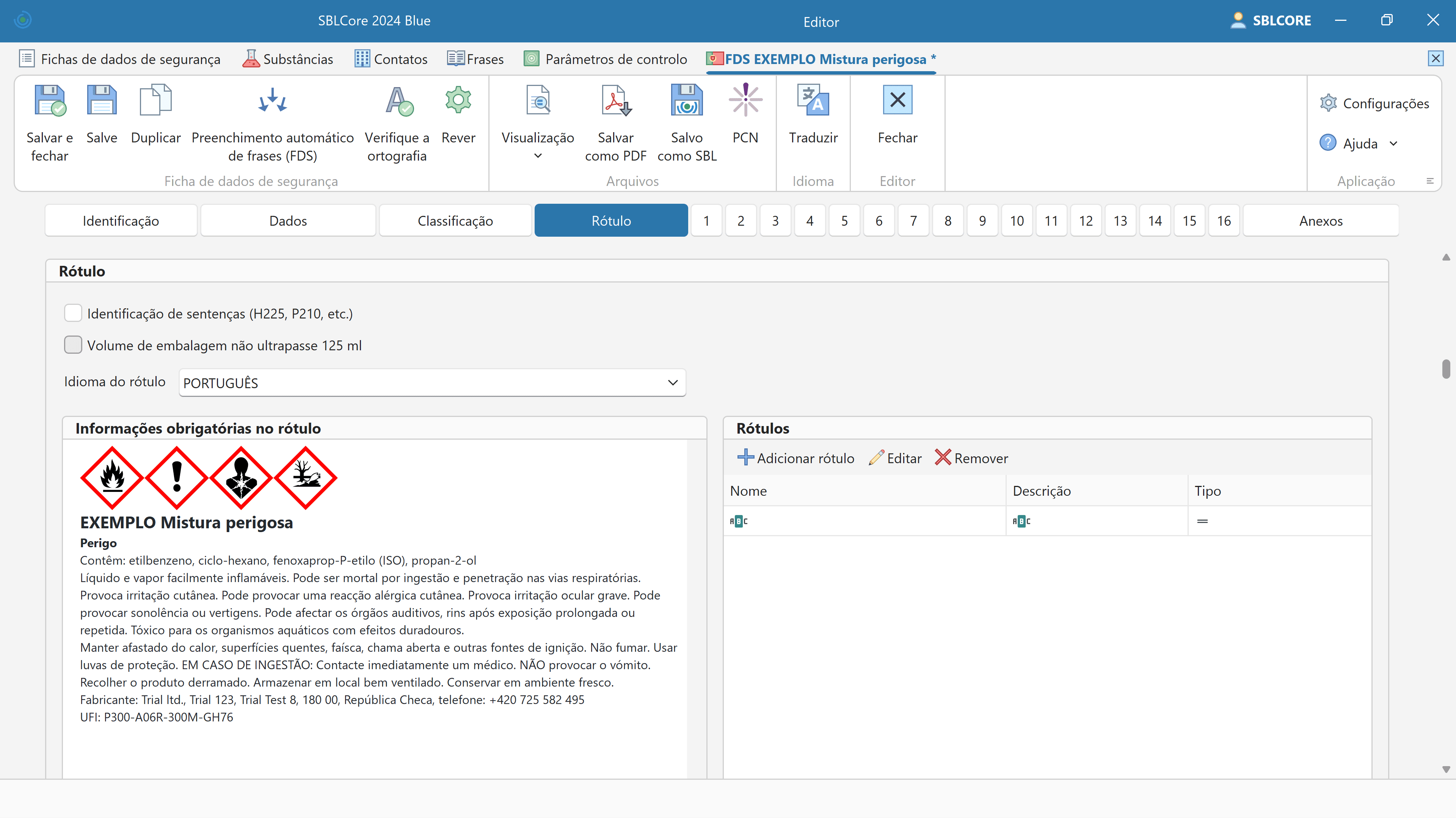 Se você luta com a criação de etiquetas e escrever um texto obrigatório é uma tarefa grata, você apreciará a função de editor de etiquetas. A SBLCore irá criar um rótulo, incluir texto obrigatório e prepará-lo em formatos amigáveis à impressão. O documento pode ser salvo em formato pdf, docx e png.